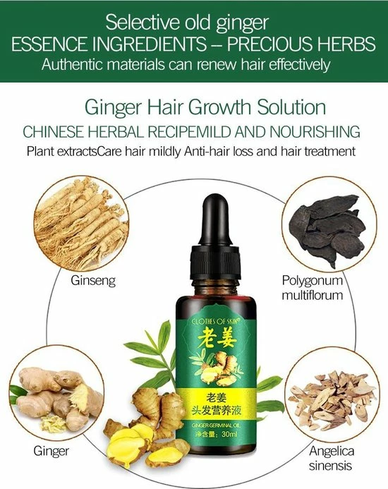 - Natuurlijke kruidenextracten – ginger extract, Polygonum multiflorum extract, ginseng extract, angelica extract, vitamin B, vitamin E,Salvia miltiorrhiza extract, water . Deze kunnen haaruitval effectief voorkomen door de haarwortels van voedingsstoffen te voorzien, beschadigd haar te herstellen, de vitaliteit van het haar te herstellen en de bloedcirculatie naar de hoofdhuid te verbeteren