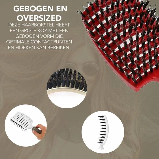 Gebogen en Oversized Head – Deze haarborstel heeft een grote kop met een gebogen vorm die optimale contactpunten en hoeken kan bereiken.