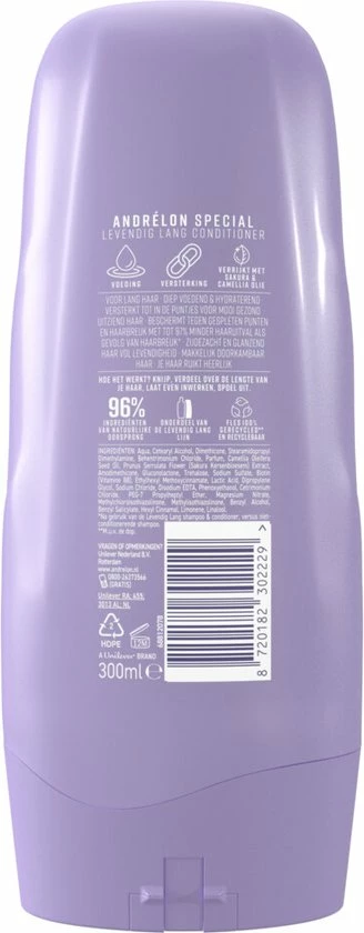 Hoe gebruik je dit product? Was eerst je haar onder de douche met de Andrélon Levendig Lang Shampoo. Breng daarna de conditioner aan. Doe dit door het product zacht in te masseren in vochtig haar. Wrijf de conditioner goed in en laat het even intrekken. Spoel de conditioner goed uit. Vermijd oogcontact. Is er toch sprake van oogcontact? Spoel de conditioner dan goed uit met warm water.