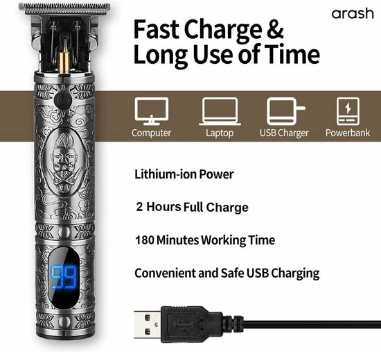 De hoogwaardige lithium-ionbatterij levert tot 120 minuten gebruikstijd na 1 uur opladen. Met een snelle oplaadbeurt van 5 minuten kun je één keer volledige trimmen.