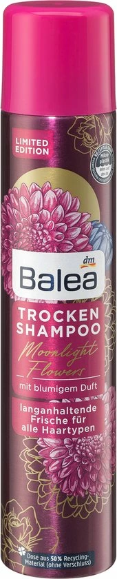 De Balea Dry Shampoo Moonlight Flowers maakt een bliksemsnelle droge wasbeurt voor tussendoor mogelijk. In enkele seconden wordt het haar weer fris, krijgt het nieuwe grip en volumineuze volheid. Voor een fris en verzorgd uiterlijk. Formulering zonder microplastics en in water oplosbare zuiver synthetische polymeren.
