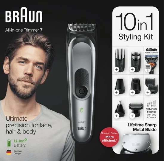 - 10-in-1 trimmer voor baard, gezicht, haar, lichaam, oor en neus trimmen en een gratis Gillette Fusion5 ProGlide scheermesje voor glad scheren, baardtrimmer, scheerapparaat