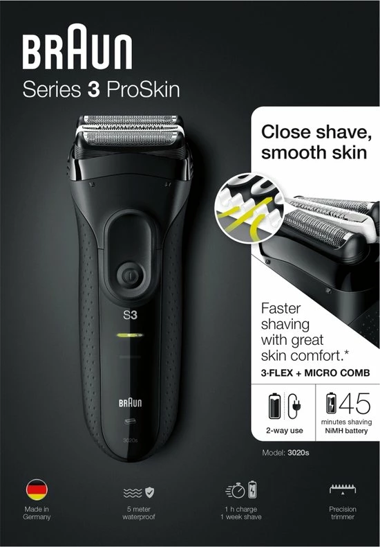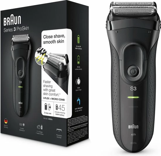 Het Braun Series 3 ProSkin 3020s oplaadbare elektrische scheerapparaat biedt een efficiënte scheerbeurt in slechts één beweging
