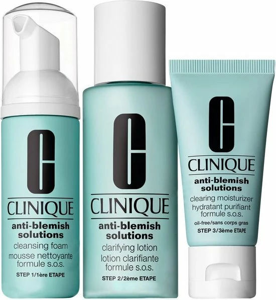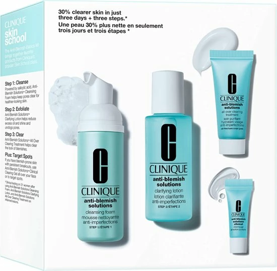 Na een paar dagen zie je al resultaat met Cliniqueβs Anti-Blemish Solutions Clear Skin System Starter Kit. Na twee weken zal je gegarandeerd een gladdere, schonere huid zien. Een glimmende huid behoort vanaf nu tot het verleden. Die vergrote poriΓ«n? Minder zichtbaar. Deze handige kit bevat de drie stappen: reinigen, exfoliΓ«ren en hydrateren.
