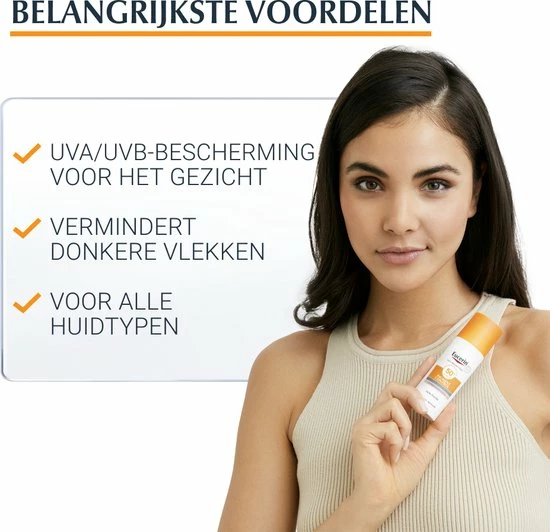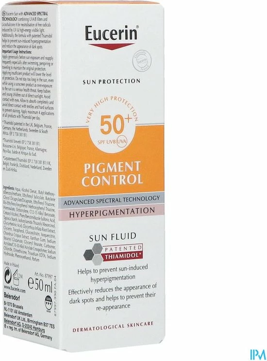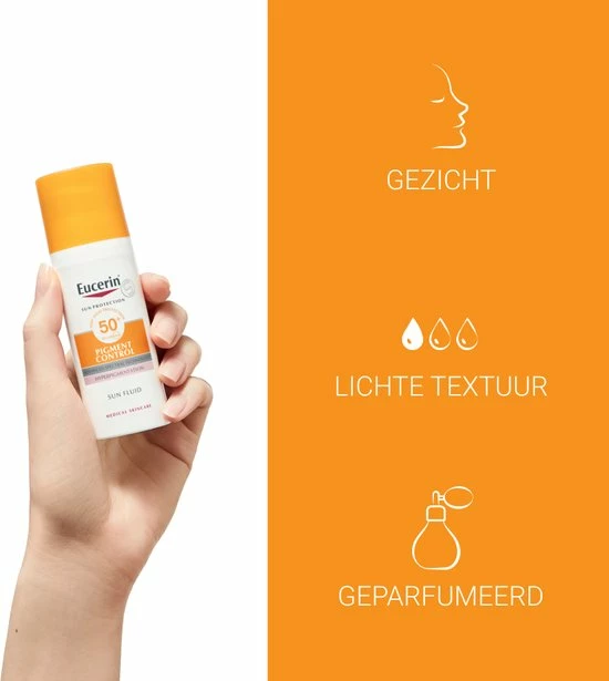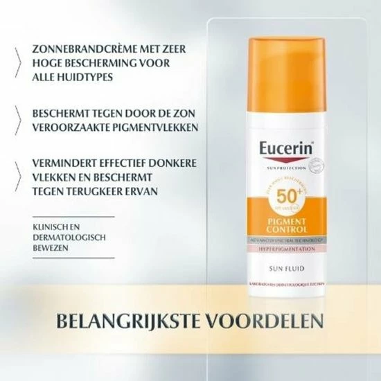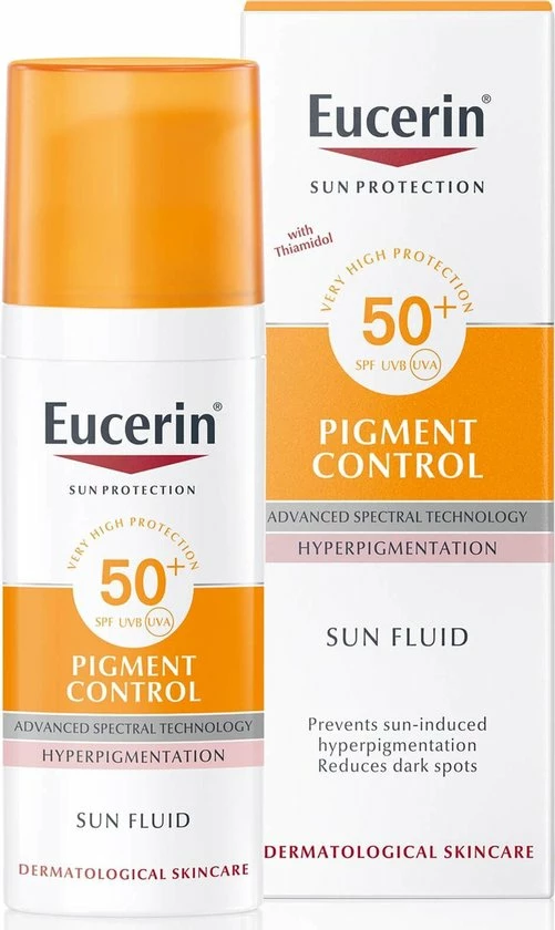 Biedt dankzij factor 50+ bescherming tegen UV-licht (UVA/UVB).De Sun Fluid van Eucerin beschermt tevens ook tegen HEVIS-licht (zichtbaar licht met hoge energie). Daarnaast voorkomt deze door de zon veroorzaakte hyperpygmentatie. De pigmentcontrole vermindert effectief donkere vlekken en voorkomt dat ze opnieuw verschijnen. Ondersteunt het eigen DNA-herstelmechanisme van de huid.