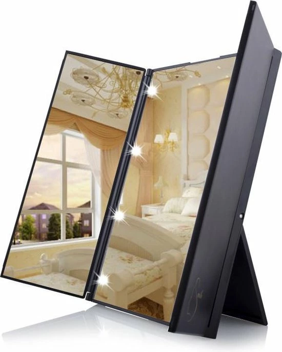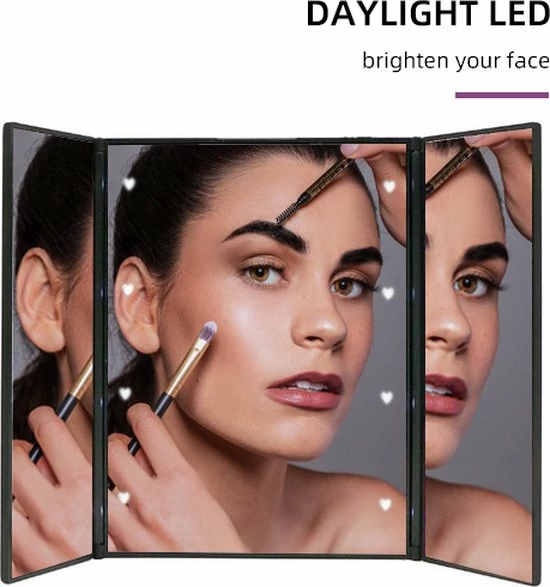 De 3 secties van de Drieluik LED make-up spiegel 2+3 maal vergroting.