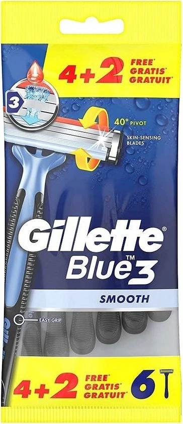 Met het Gillette Blue3 wegwerpmesje voor mannen heb je altijd een geweldige scheerbeurt binnen handbereik. Met lubrastrip, 3 mesjes die de huid volgen, een Easy Grip-handvat voor perfecte controle en een 40Β° draaiend scheerhoofd dat zich aan je gezichtscontouren aanpast.