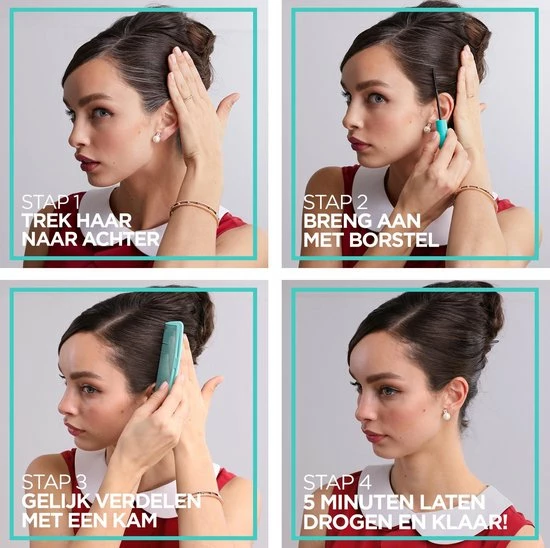 Strijk het haar naar achteren en borstel voorzichtig met de Magic Retouch First Greys borstel de slapen en individuele grijze haren die je wil camoufleren. Kam voorzichtig met een reguliere kam door het haar om het product gelijkmatig te verdelen. Laat de formule 5 minuten drogen.