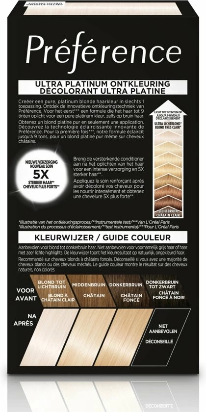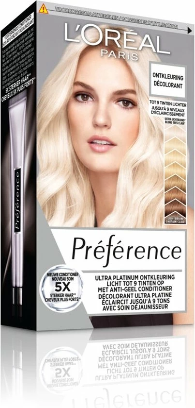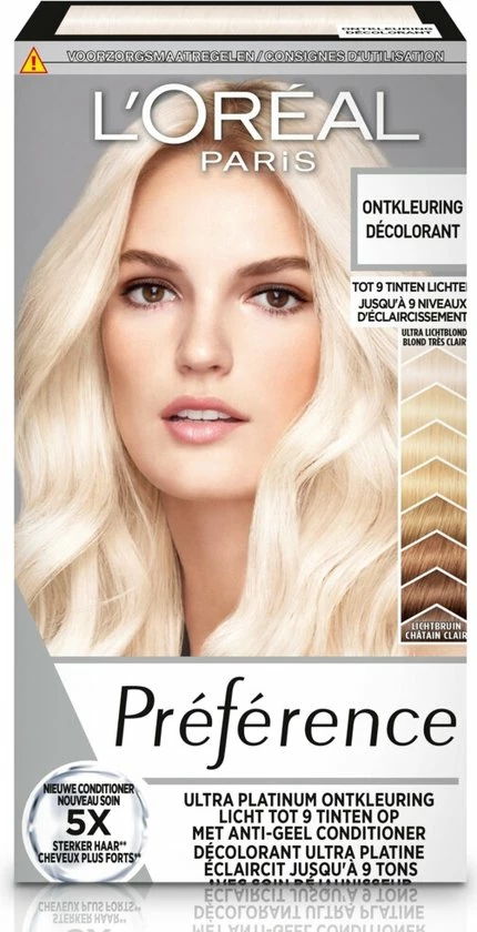 LβOrΓ©al Paris PrΓ©fΓ©rence Ultra Platinum is een ontkleuring die het haar tot 9 tinten lichter kleurt. De ontkleuring is geschikt om zowel natuurlijk, ongekleurd haar als reeds gekleurd haar lichter te kleuren.