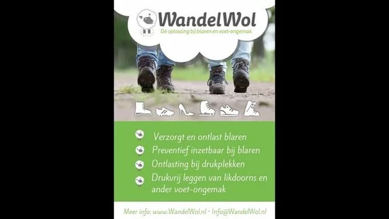 afbreekbaar. WandelWol antidruk-producten absorberen transpiratievocht en ventileren. Zorgt voor warme voeten in de winter en verkoelt in de zomer. De antidruk-wol verzacht ontstane blaren en voorkomt blaarvorming. Werkt druk-ontlastend en is een behoud voor teennagels en voeten.