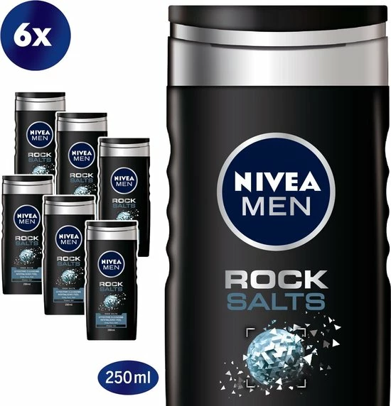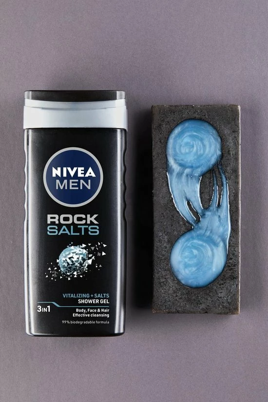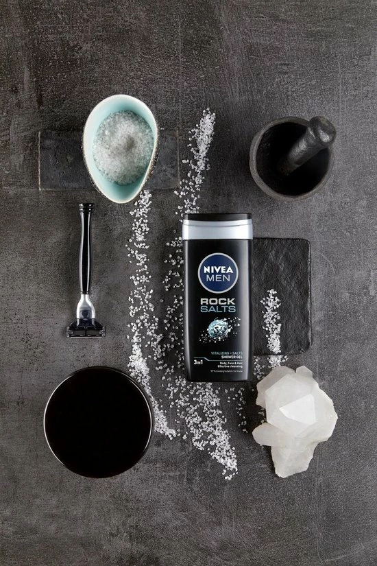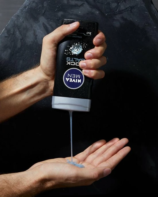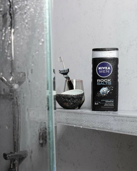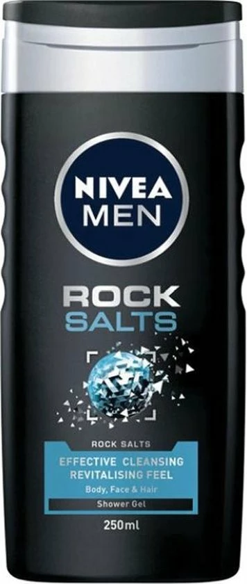 NIVEA MEN Rock Salts Douchegel. VOOR MANNEN die een verzorgende douchegel voor grondige reiniging en verfrissing willen. De formule met gemalen rotszouten zorgt ervoor dat de huid grondig wordt gereinigd, terwijl de huid intensief wordt verzorgd. Breng de douchegel eenvoudig aan op je hele lichaam, gezicht en haar. Masseer de douchegel in en spoel alle restanten af voor het drogen. Geschikt voor dagelijks gebruik.