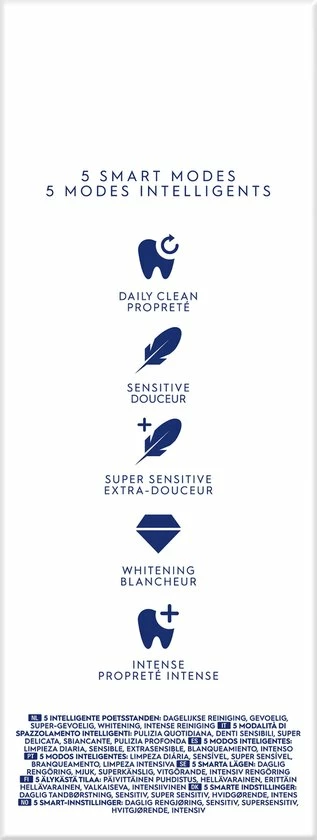 - 5 poetsstanden om uw poetsbeurt te personaliseren: Dagelijkse reiniging, Intense reiniging, Whitening, Gevoelige tanden, Supergevoelige tanden
