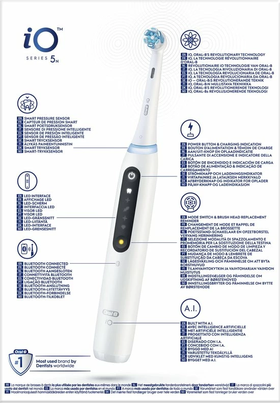 De iO 5 elektrische tandenborstel is voorzien van de beste technologie van Oral-B en combineert een door tandartsen geïnspireerde ronde borstelkop met micro-vibrerende borstelharen voor een professioneel reinigend gevoel thuis. De slimme poetsdruksensor helpt voorkomen dat u te hard of te zacht poetst om uw tandvlees beter te beschermen. A.I.-poetsherkenning herkent uw poetsstijl en begeleidt u om elke dag beter te poetsen. Maakt verbinding met de gratis Oral-B-app voor realtime poetstracking en begeleiding doorheen de 6 poetszones. Vervang uw Oral-B iO opzetborstel elke 3 maanden voor de beste resultaten.