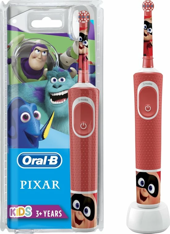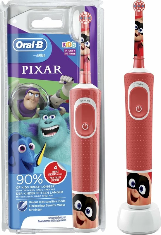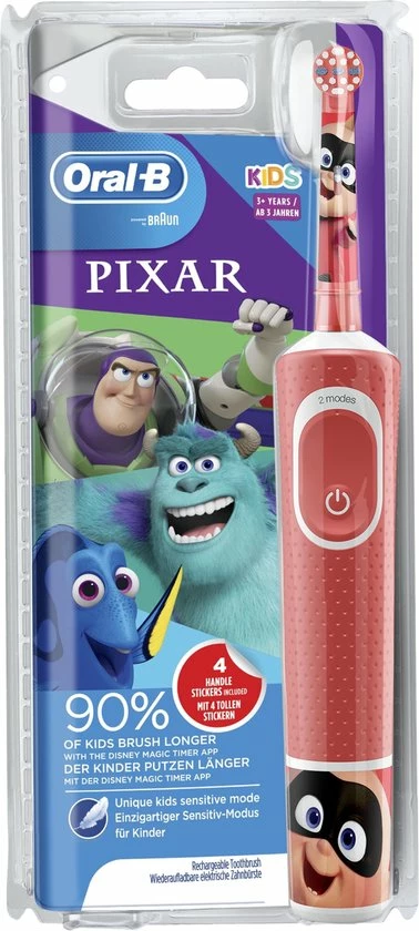 Met de Oral-B Kids elektrische tandenborstel voor kinderen vanaf 3 jaar kunnen kinderen plezier beleven aan Disney Best of Pixar Γ©n genieten van de milde, effectieve reiniging van een door tandartsen aanbevolen tandenborstel van Oral-B. Met een unieke, kindvriendelijke gevoelige modus reinigt deze borstel de tanden van kinderen voorzichtig. Hij verwijdert meer tandplak dan een gewone manuele tandenborstel. Er zitten vier leuke Disney Best of Pixar-stickers bij om het handvat mooier te maken..