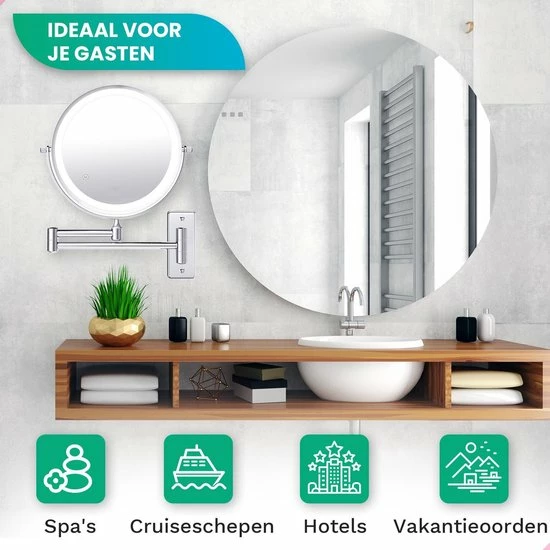 Deze wandspiegel beschikt over een 5-voudige vergroting aan een van de zijden, en een mooie en heldere LED verlichting aan beide zijden. De belichting is gelijkmatig en wit, ideaal voor een perfecte opmaak en verzorging zonder enige last van overbelichting en verblinding.