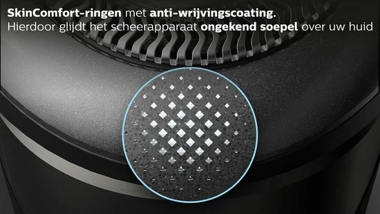Ervaar een ultiem gladde en soepele scheerbeurt dankzij de SkinComfort-ringen met anti-wrijvingscoating. Hierdoor glijdt het scheerapparaat ongekend soepel over je huid.