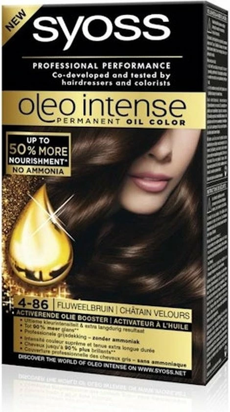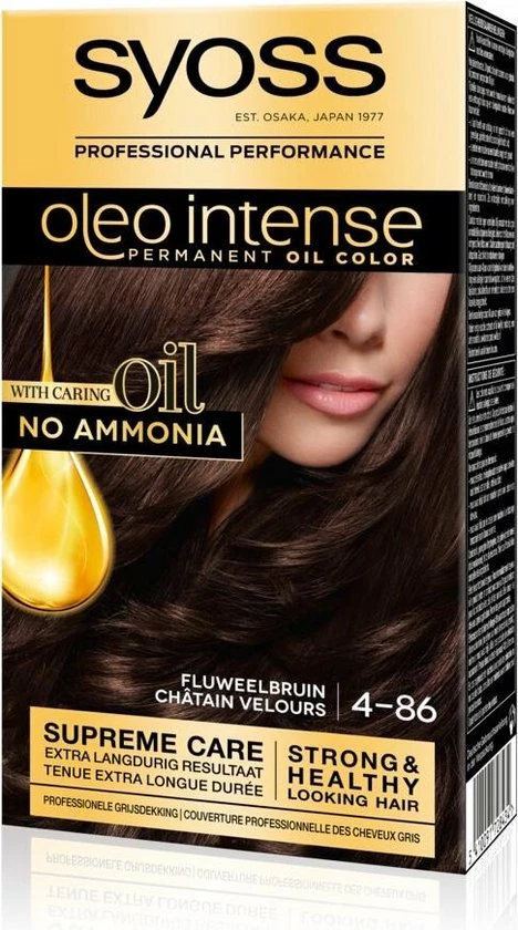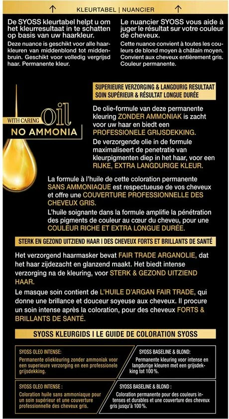 Syoss Oleo Intense is onze eerste permanente kleuring geactiveerd door oliën: de speciaal ontworpen formule is verrijkt met een activerende olie booster die het kleurproces maximaliseert, voor een superieure en langdurige kleurintensiteit met een professionele grijsdekking. Geheel zonder ammoniak geeft de unieke, niet druppende Olie-in-Crème formule het haar een extra verzorgende boost. Tot 50 % beter gevoed, sterker en gezond uitziend haar en tot wel 90 % meer glans. Geschikt voor middenblond tot middenbruin haar.