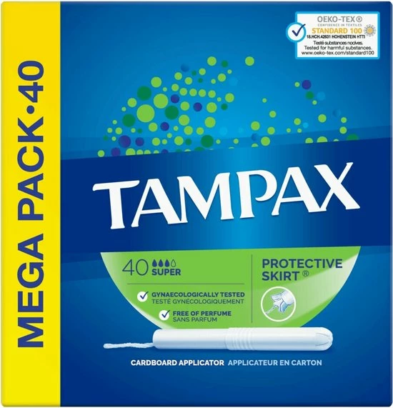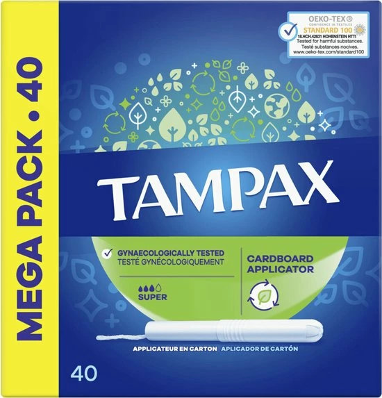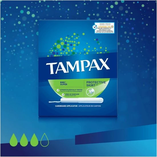 De Tampax Super tampons met kartonnen inbrenghuls helpen je schoon en zelfverzekerd te voelen. Tampax tampons hebben een absorberende kern en een anti-lekrokje voor extra bescherming; hun kartonnen inbrenghuls heeft een anti-slipgrip zodat je hem makkelijk kunt inbrengen. De Tampax Super tampons met kartonnen inbrenghuls zijn bedoeld voor dagen met een gemiddelde tot hevige menstruatie. Voel je schoon en zelfverzekerd. Probeer Tampax Compak Pearl, onze beste bescherming in het Tampax-assortiment.