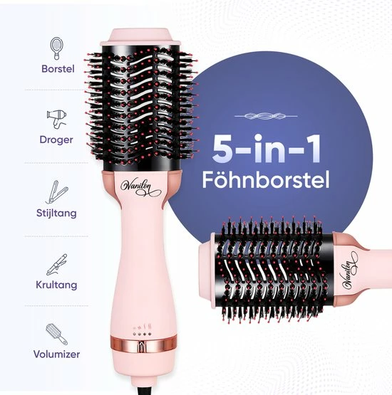 Blaas volume en body in het haar, en creΓ«er iedere dag een glanzende Salon Look met Vanilon 5-in-1 FΓΆhnborstel. Met onze fΓΆhnborstel geef je het haar een goede volume boost en geniet je van een vollere look. Geschikt voor het stylen van lang, kort, vol of krullend haar. De ionische functie van de multistyler maakt je haar heerlijk zacht en geeft pluisvrij resultaat. Gun je haar de beste verzorging met de 5-in-1 FΓΆhnborstel van Vanilon!