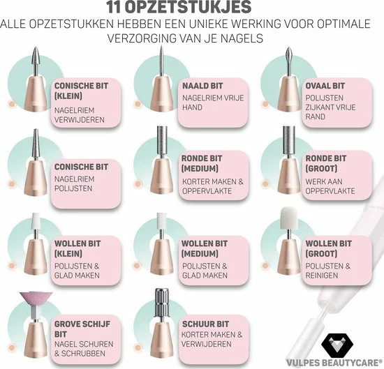 Een goede manicure is erg belangrijk voor je nagels. De manicure- en pedicureset van Vulpes BeautyCare® heeft maar liefst 11 nagelfrees opzetstukjes, voor alles van vijlen, schuren, polijsten tot exfoliëren. Daarnaast komt deze set inclusief 96 schuurrolletjes, zodat je voldoende voorraad hebt om je nagels lang te verzorgen!