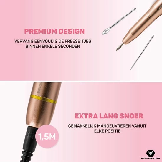 De elektrische nagelvijl set van Vulpes BeautyCare® is niet alleen geschikt voor natuurlijke nagels, maar ook voor acryl- en gelnagels. Ook met weinig ervaring heb je het gebruik van de elektrische nagelvijl zo onder de knie. De 12W motor zorgt ervoor dat de nagelfrees niet heet wordt, weinig geluid maakt en weinig vibreert. Bovendien kan je door het 1,50 meter lange snoer zitten waar je wilt. Pauzeer wel na elke 20 minuten om je nagelfrees wat rust te geven.