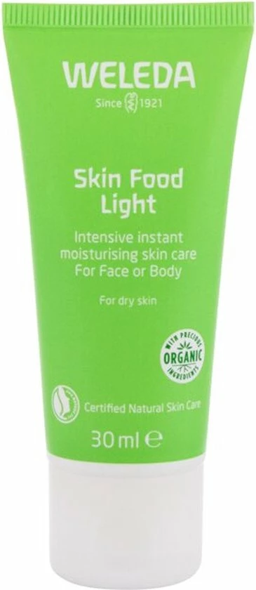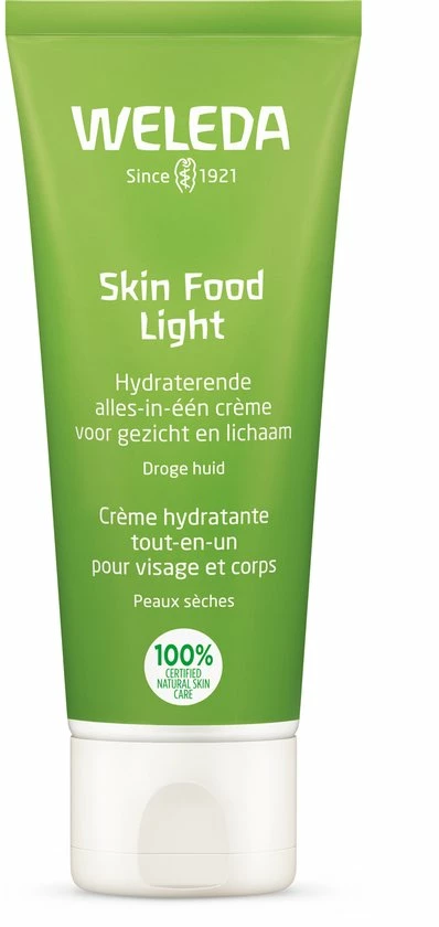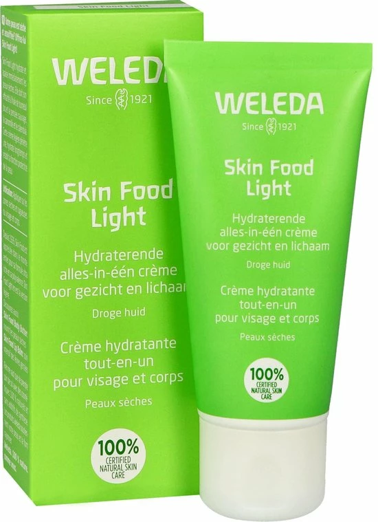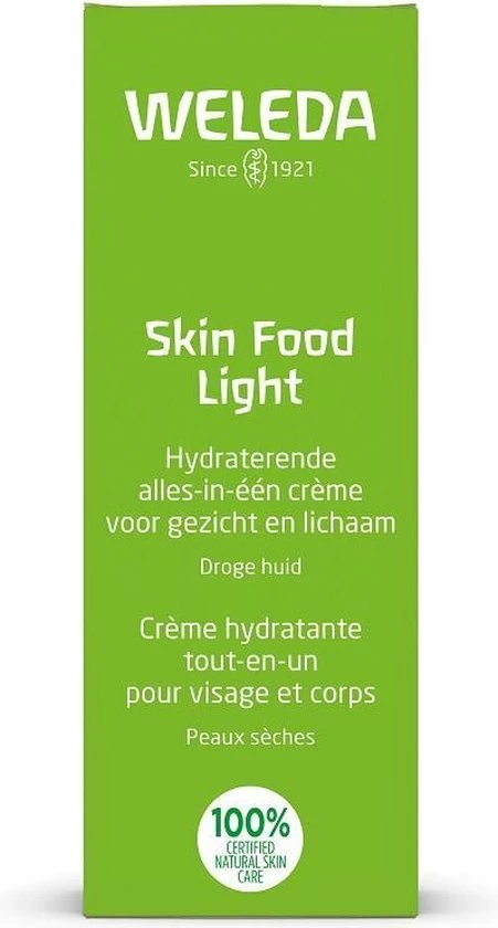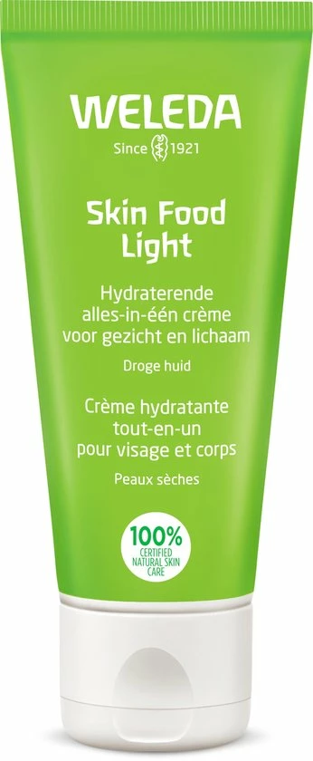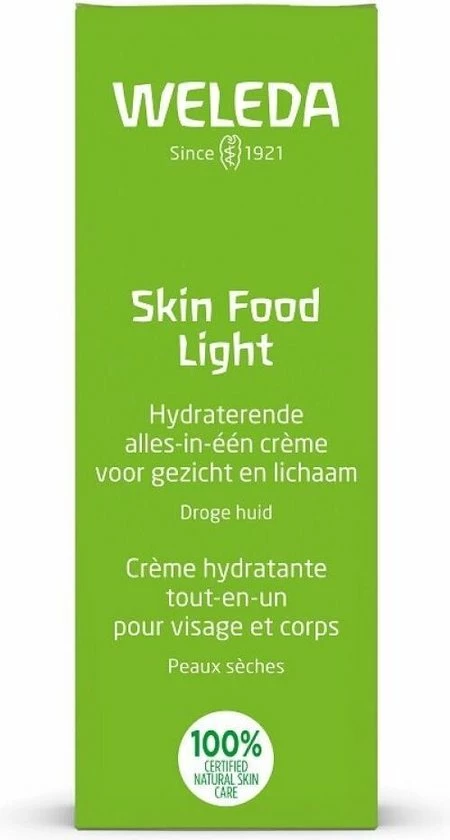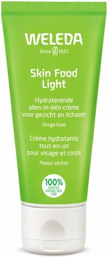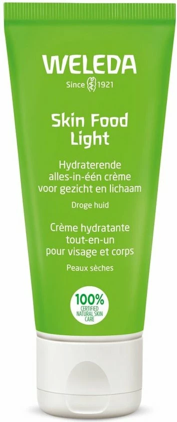 Skin Food Light is een welkome dorstlesser voor de droge huid. Ze biedt namelijk onmiddellijke hydratatie en comfort door haar lichte, snel intrekkende formule. Het geheim van deze crème is de combinatie van biologische zonnebloemolie met o.a. driekleurig viooltje, kamille en Calendula. De crème hydrateert de huid langdurig en herstelt de barrièrefunctie.